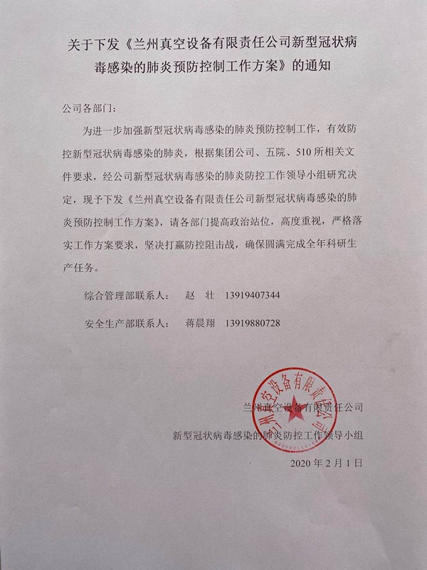 接到新型冠狀病毒感染的肺炎疫情防控工作要求的第一時間,他們便趕到公司,制定下發了公司《關于進一步加強新型冠狀病毒感染的肺炎預防控制工作的緊急通知》,成立了公司“新型冠狀病毒感染的肺炎防控工作領導小組”,擔負起了防控小組的主要日常工作,為保障假日期間信息渠道通暢,兩個人的手機24小時保持開機暢通狀態,隨時處理各方面的信息,除了認真收集、匯總信息外,兩位同志還在2月1日制定下發了《蘭州真空新型冠狀病毒感染的肺炎預防控制工作方案》,為公司疫情防控工作提供了制度保障。